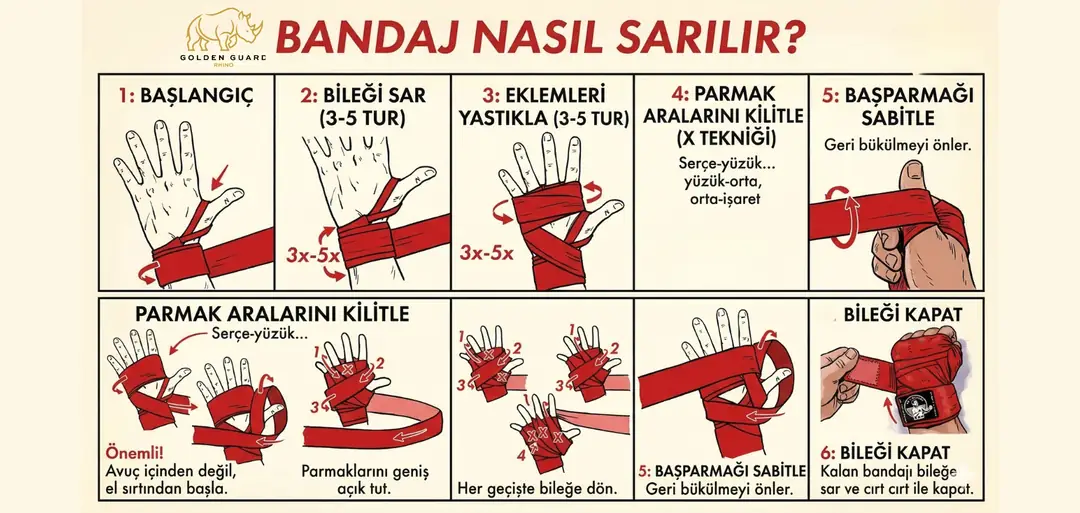 Golden Guard Rhino bandajları, bu rehberdeki tüm adımları sorunsuz uygulayabileceğin şekilde tasarlandı. 4 metre uzunluk, %65 pamuk Meksika usulü doku, 13mm enjeksiyonlu cırt cırt ve Simple Triangle parmak halkası — her detay, doğru sarımı kolaylaştırmak için var.